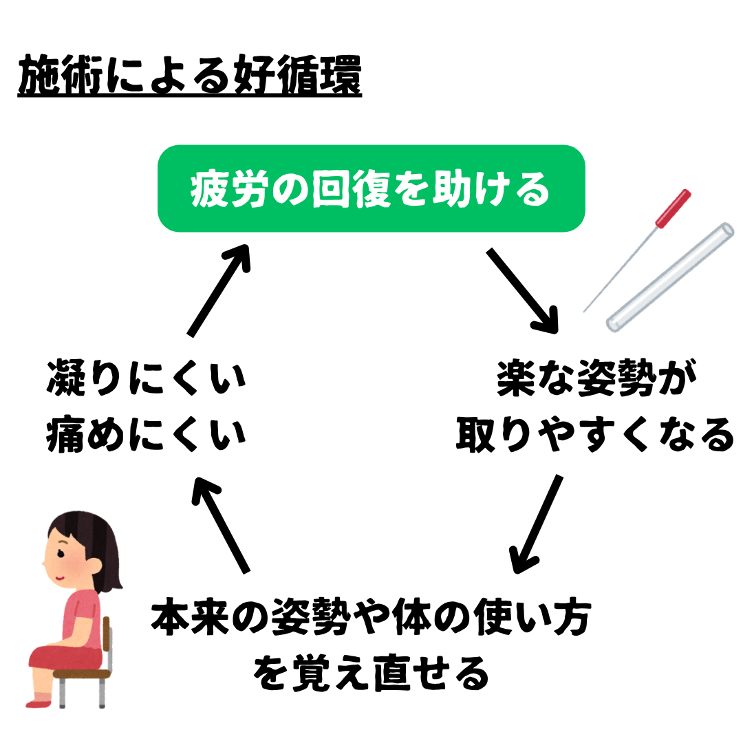 広い範囲の血流をよくするのは手でほぐす方が向いていますが、狭い範囲のかたさには針をあてることで筋肉を緩めることができます